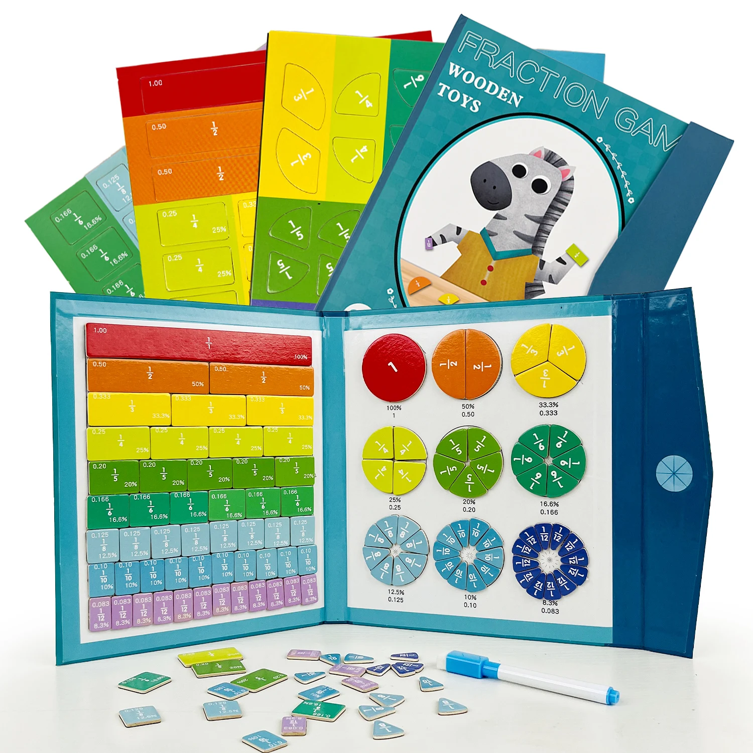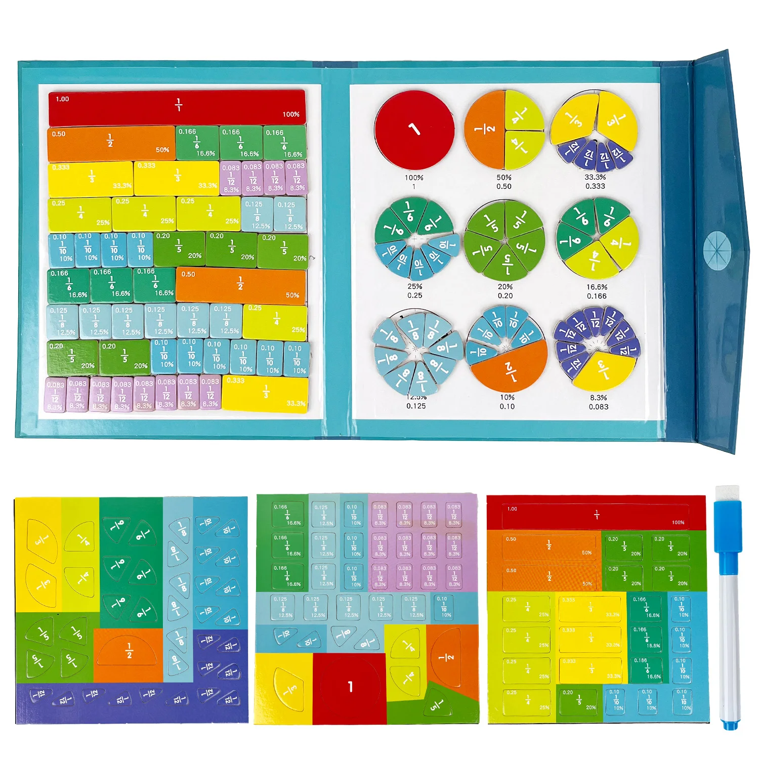 The set includes a sturdy folding board filled with fraction bars and circular fraction pieces in vibrant colors. Each piece clearly shows the fraction along with its decimal and percentage equivalent, helping kids build strong math skills while playing. The kit also comes with activity cards and a dry-erase marker for practicing problems and creating fraction challenges.