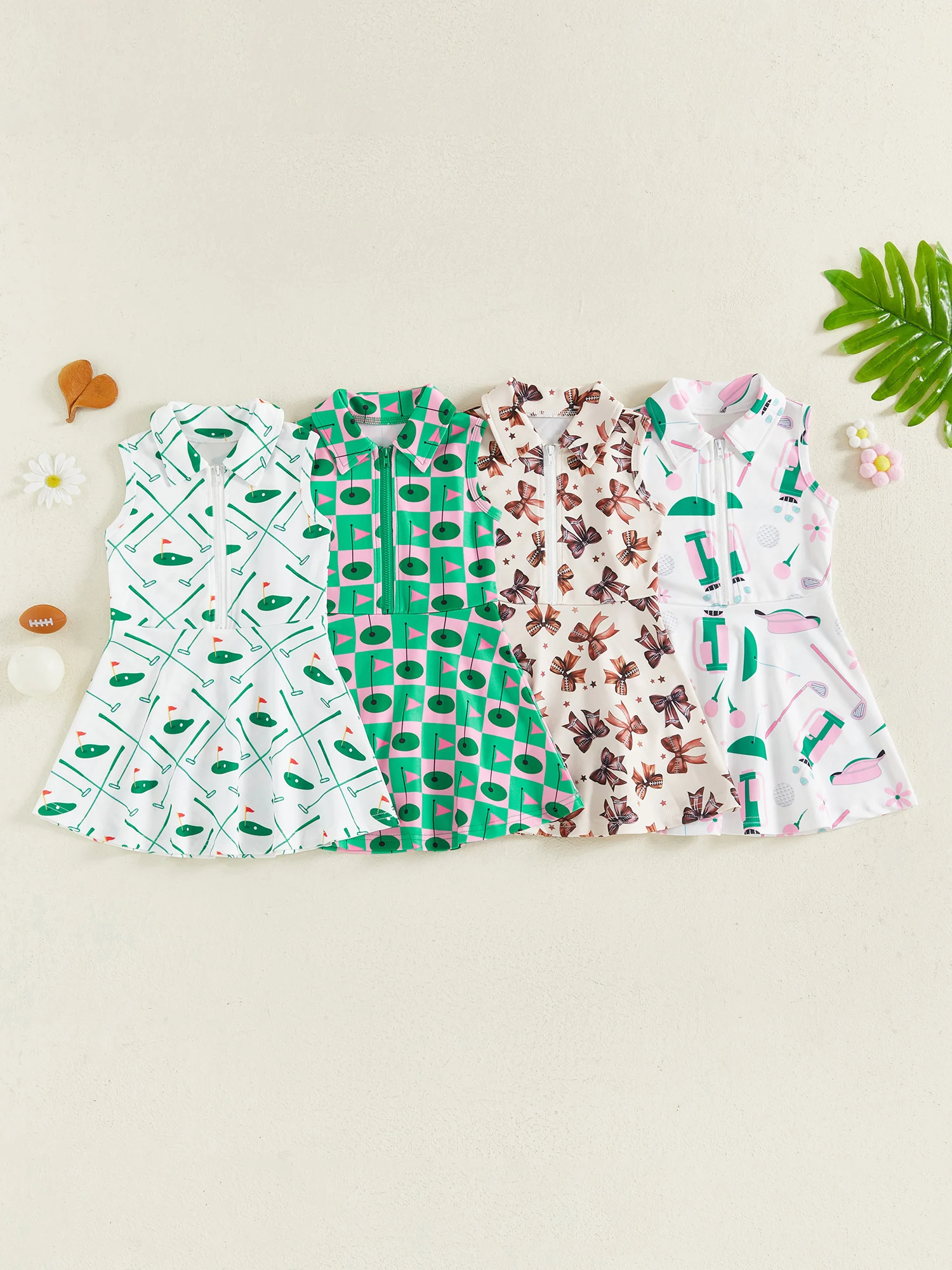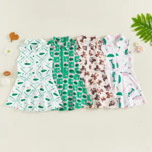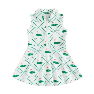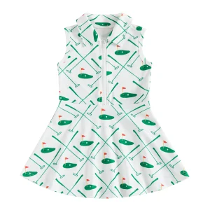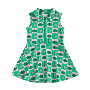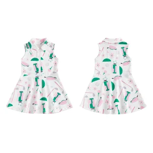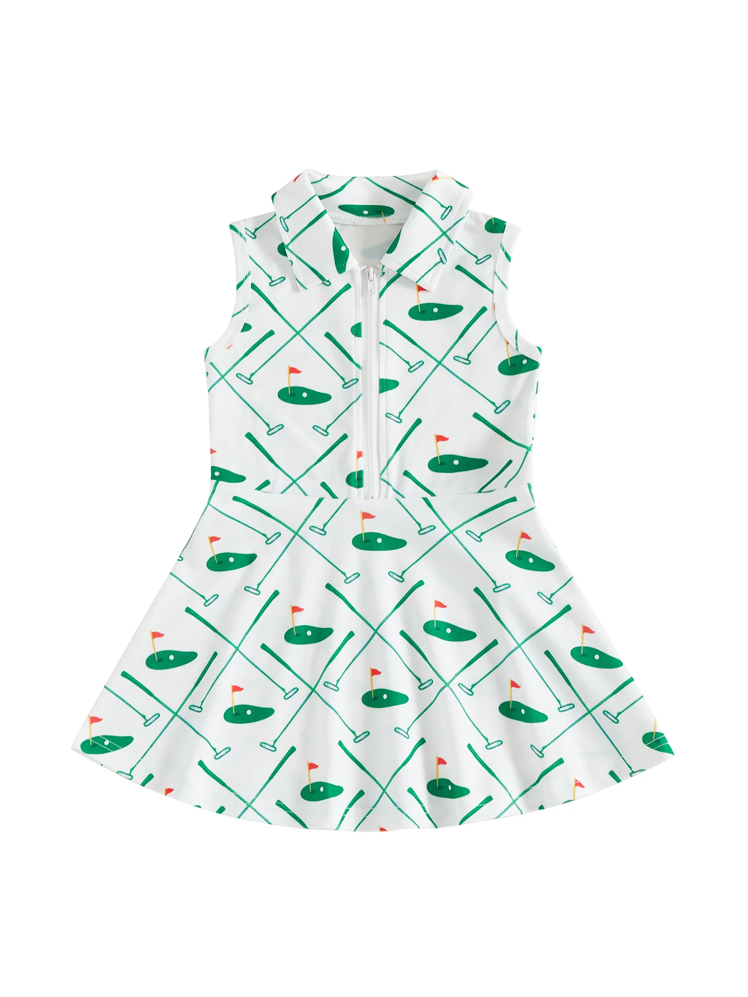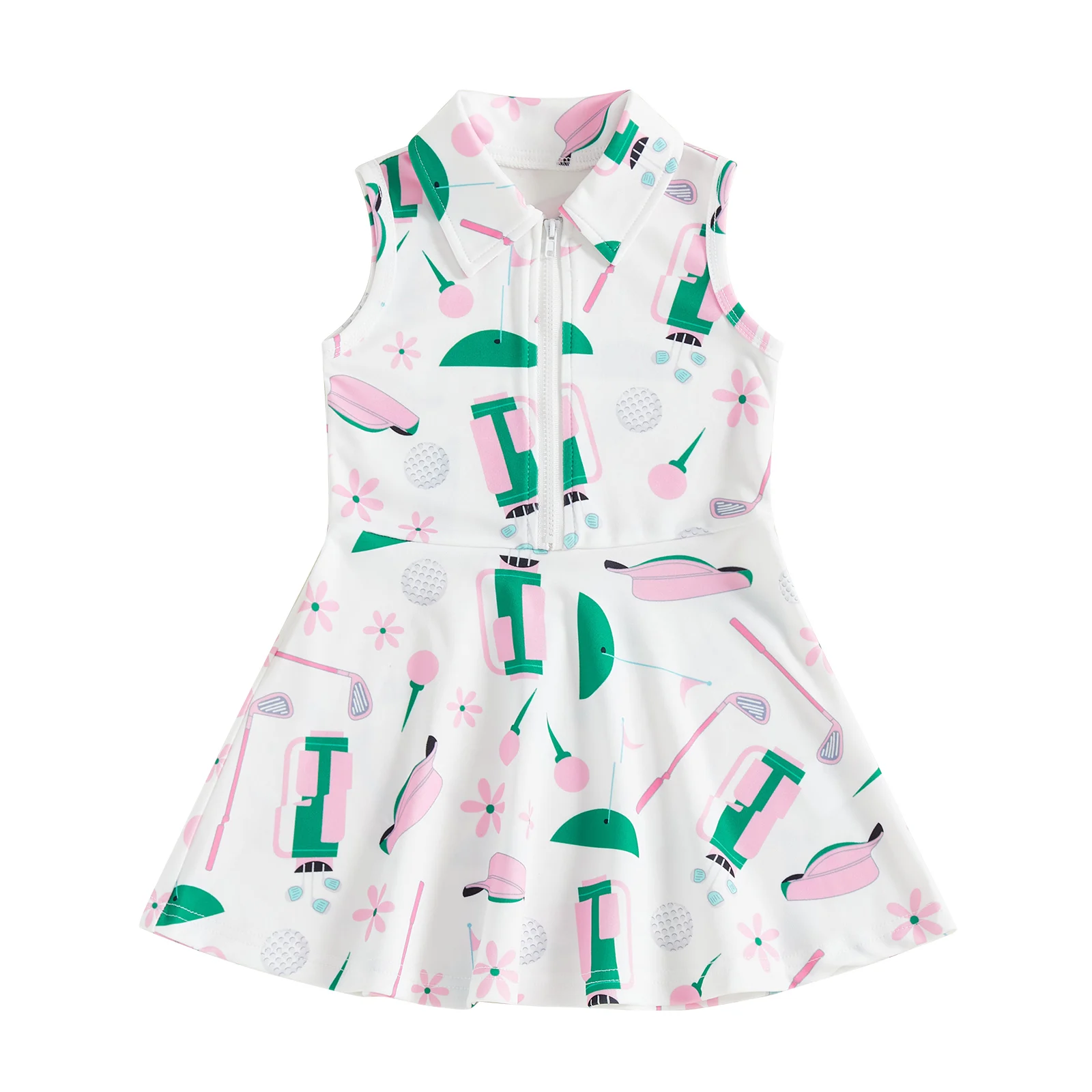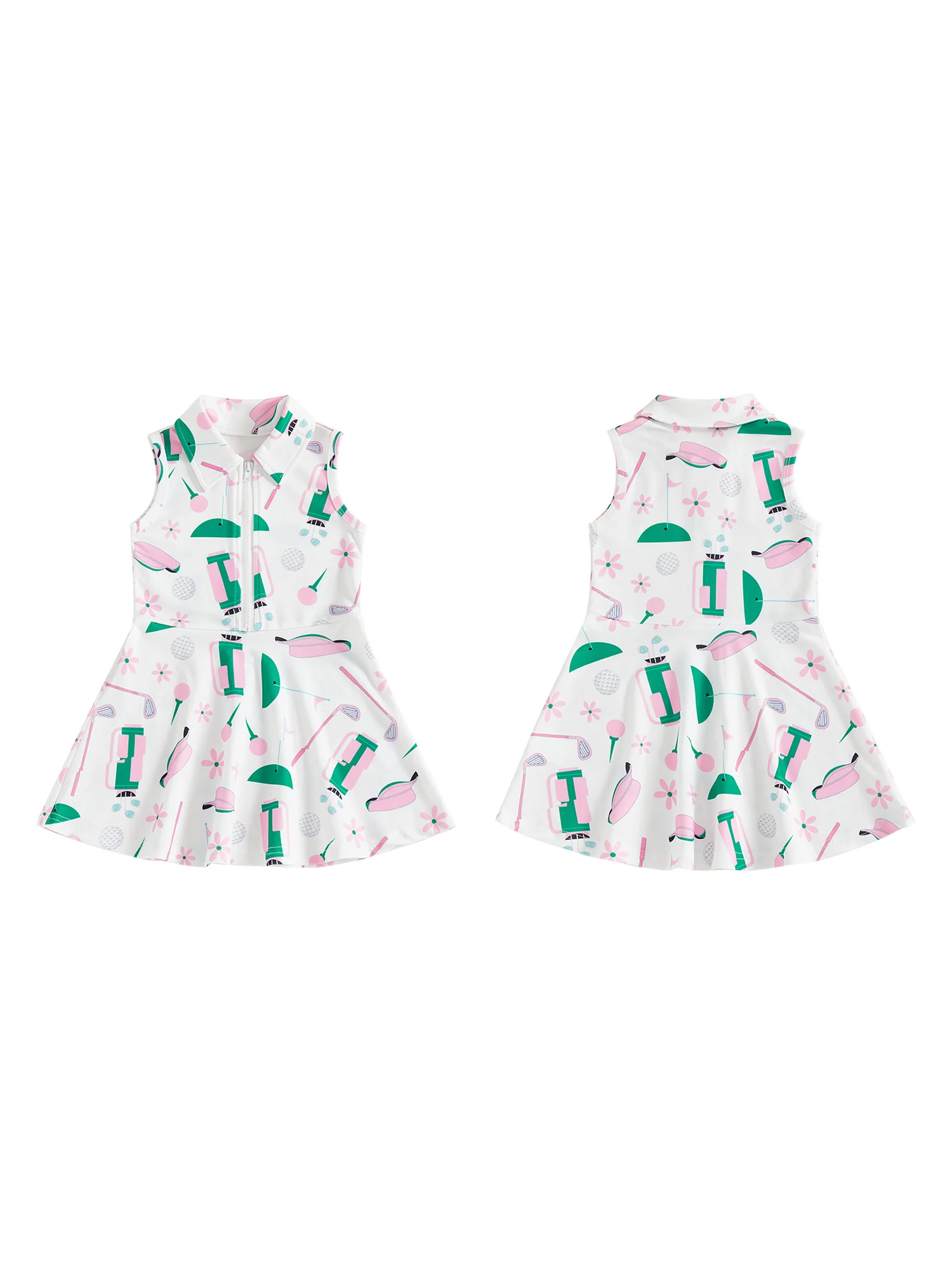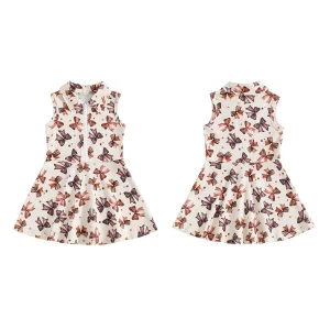 The dress includes a stylish collar and front zipper, giving it a modern, easy-to-wear design while making dressing quick and convenient. Its sleeveless cut and flared skirt provide comfort and freedom of movement, making it ideal for active play, school days, or special outings.