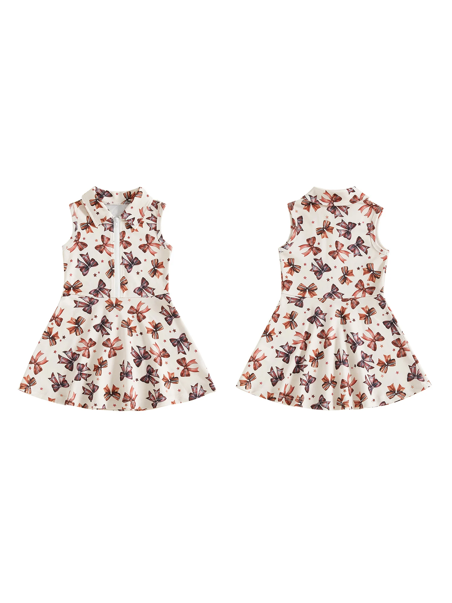 This adorable girls’ dress is the perfect blend of playful charm and sporty style. Designed with a soft cream background, it features an eye-catching pattern of bows accented with football stitching details and tiny stars, creating a fun and unique look that little girls will love.
