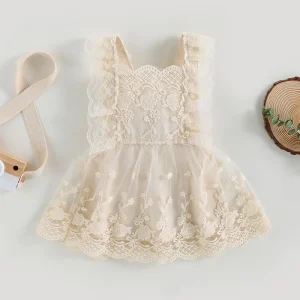 This adorable all-lace dress for babies and toddlers is the perfect blend of elegance and sweetness. Crafted entirely from delicate lace, it features a beautifully detailed floral lace bodice with wide scalloped straps that add both comfort and charm. The soft, flared skirt is layered with intricate lace patterns and a scalloped hem, creating a light and airy silhouette that looks lovely with every little movement.
