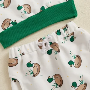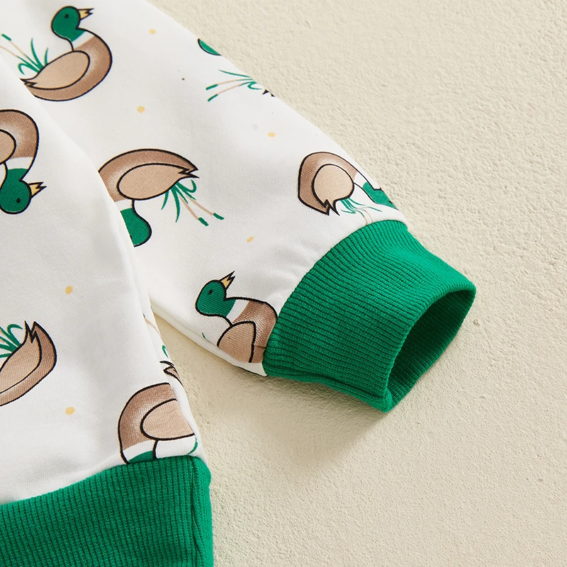 The soft white fabric is accented with bright green ribbed cuffs, collar, and waistband, creating a fresh and sporty look while helping keep the fit snug and comfortable. The playful duck pattern brings personality to the outfit, making it perfect for little ones who love animals and outdoor adventures.