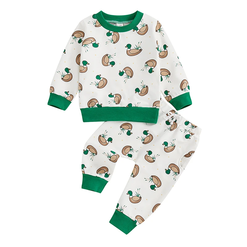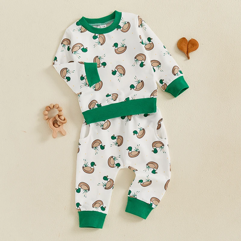Perfect for playtime, daycare, or casual outings, this cute duck-print set combines comfort, durability, and adorable style for little boys. 🦆💚