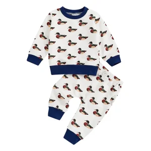 This adorable little boys’ outfit set is perfect for everyday comfort and playful style. The two-piece set includes a long-sleeve top and matching pants, both featuring a charming all-over duck print that adds a fun and cheerful touch.